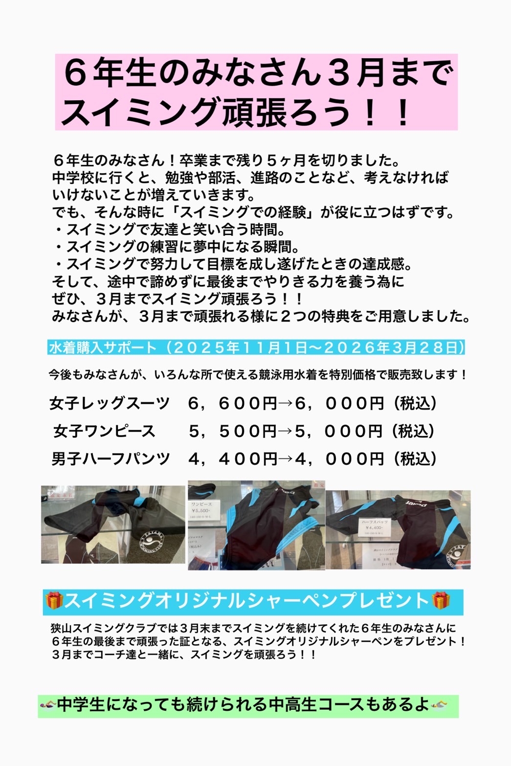 狭山スイミングクラブは「百年水泳」をクラブテーマとしております。